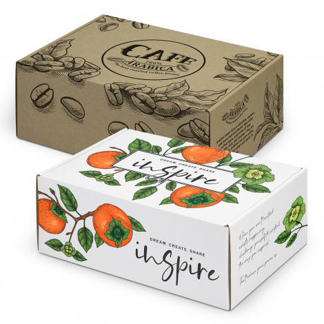 Professional custom presentation box made from durable 1.5mm e-flute corrugated cardboard to provide reliable protection during transit. This box is perfect for gifting and building strong brand recognition. Featuring a convenient hinged lid, all panels of the box can be customised with CMYK digital print. It is supplied flat-packed for easy postage and storage, and its self-locking design ensures hassle-free assembly. The assembled internal dimensions are 300mm x 225mm x 113mm (LxWxH).