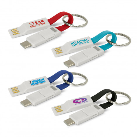 Compact charging cable with a handy key ring which folds over and snaps together with a strong magnetic closure. It has a USB connector on one end and a USB Type-C connector on the other. Simply pull and flip the USB Type-C connector to expose a unique twin connector which has Lightning (for iPhone) on one side and Micro-B USB on the other. Electron is for charging only and is not designed for data connections.