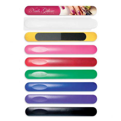 Handy nail file with both fine and coarse filing surfaces. It is presented in a sleeve for storage when not in use.